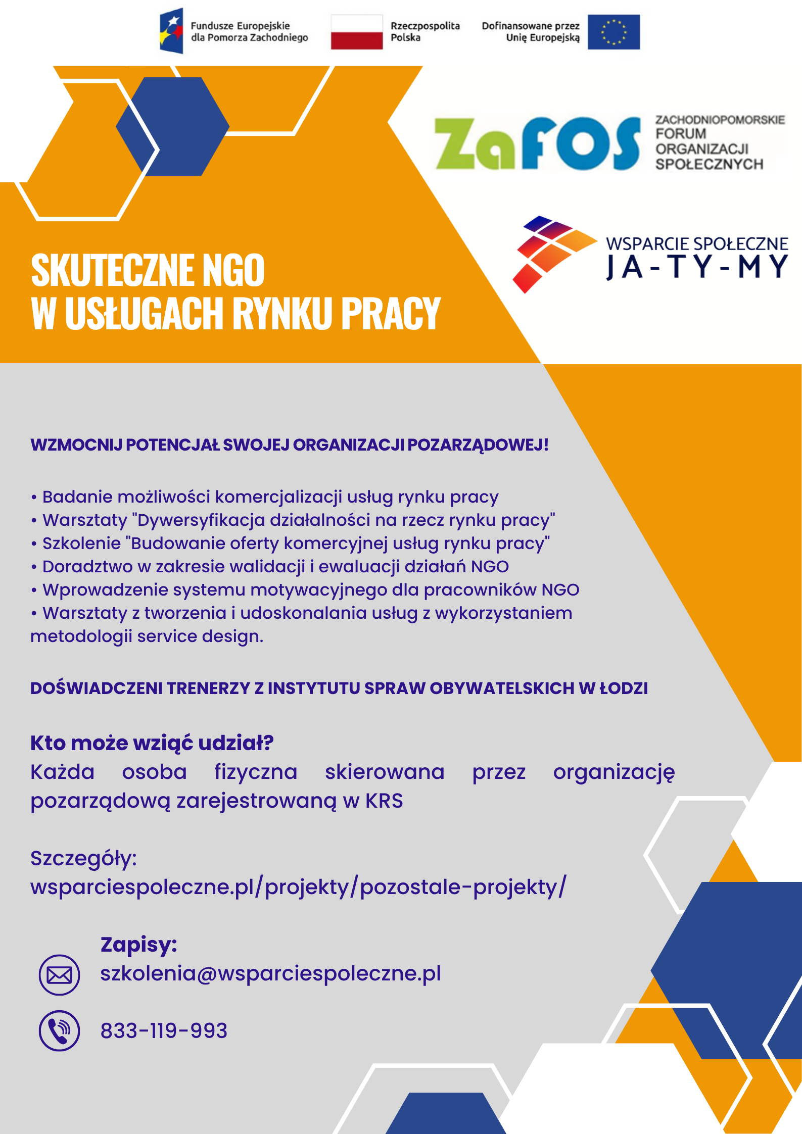 Serdecznie zapraszamy do udziału w bezpłatnym projekcie szkoleniowym finansowanym ze środków Unii Europejskiej realizowanym przez Zachodniopomorskie Forum Organizacji Społecznych oraz Stowarzyszenie Wsparcie „Ja-Ty-My” w Łodzi.